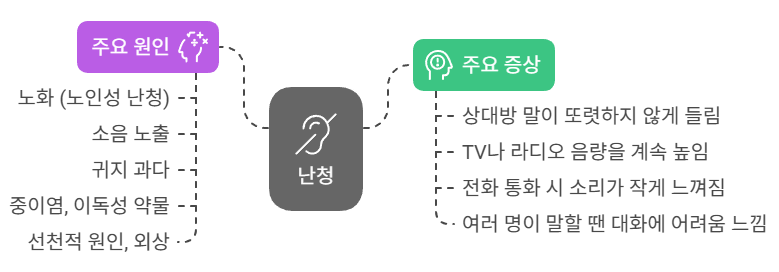 | 전음성 난청 | 고막·중이의 문제로 소리 전달 장애 |