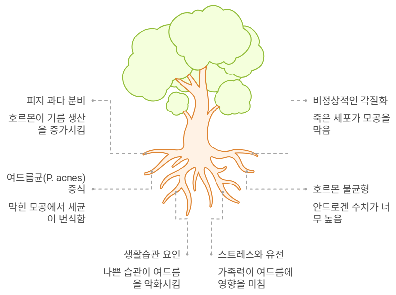 1. 과도한 피지 분비 : 호르몬 변화(사춘기, 생리, 스트레스 등)에 의해 증가