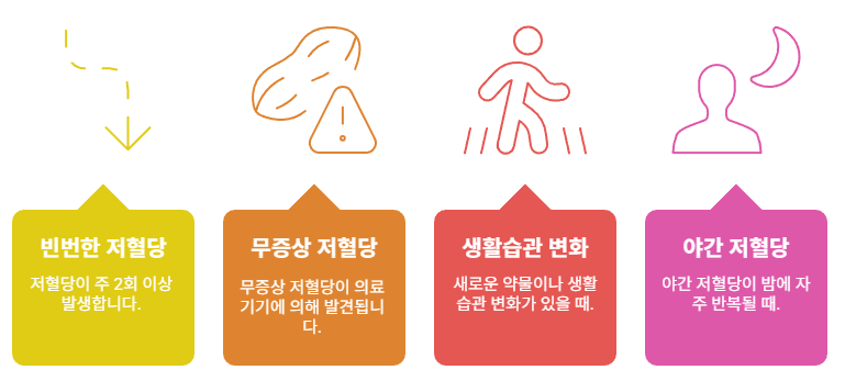 ▶ 특히 고령의 당뇨 환자, 신체 활동량이 많은 환자, 식사 간격이 긴 경우 주의가 필요합니다.
